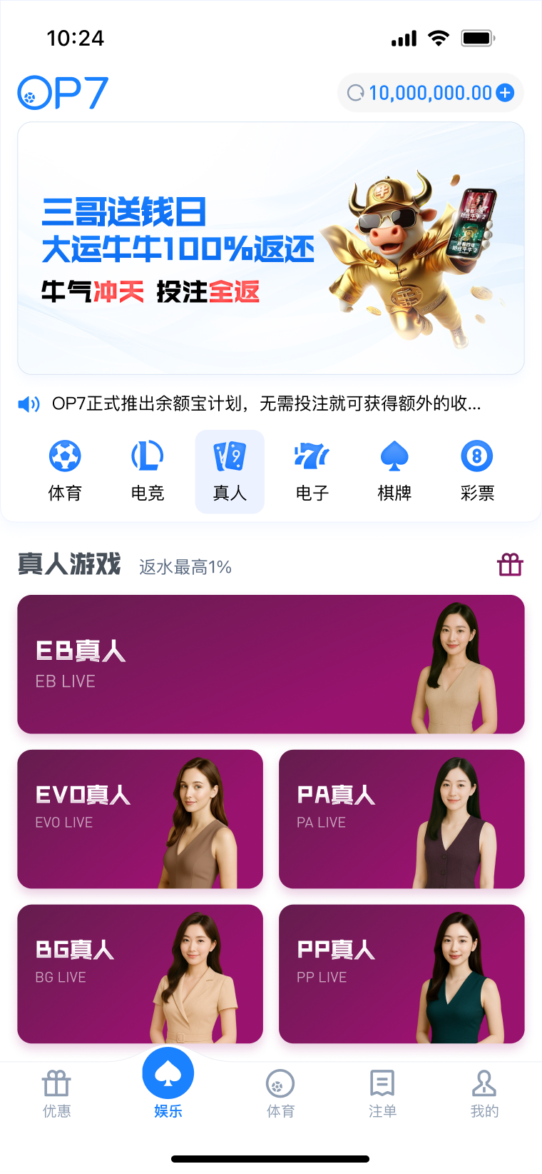 公告: 1、品牌升级公告:为促进平台长期稳定发展规划,「EMC易倍」平台已完成合规和品牌升级,即日起,品牌正式升级为 「OP7」。 2、巅峰预言家:洞见赛果,亮出你的剧本 3月9日 02:00 本菲卡vs波尔图 3、OP7霸王餐包赔 投注多场指定赛事,享指定场馆总负盈利包赔!